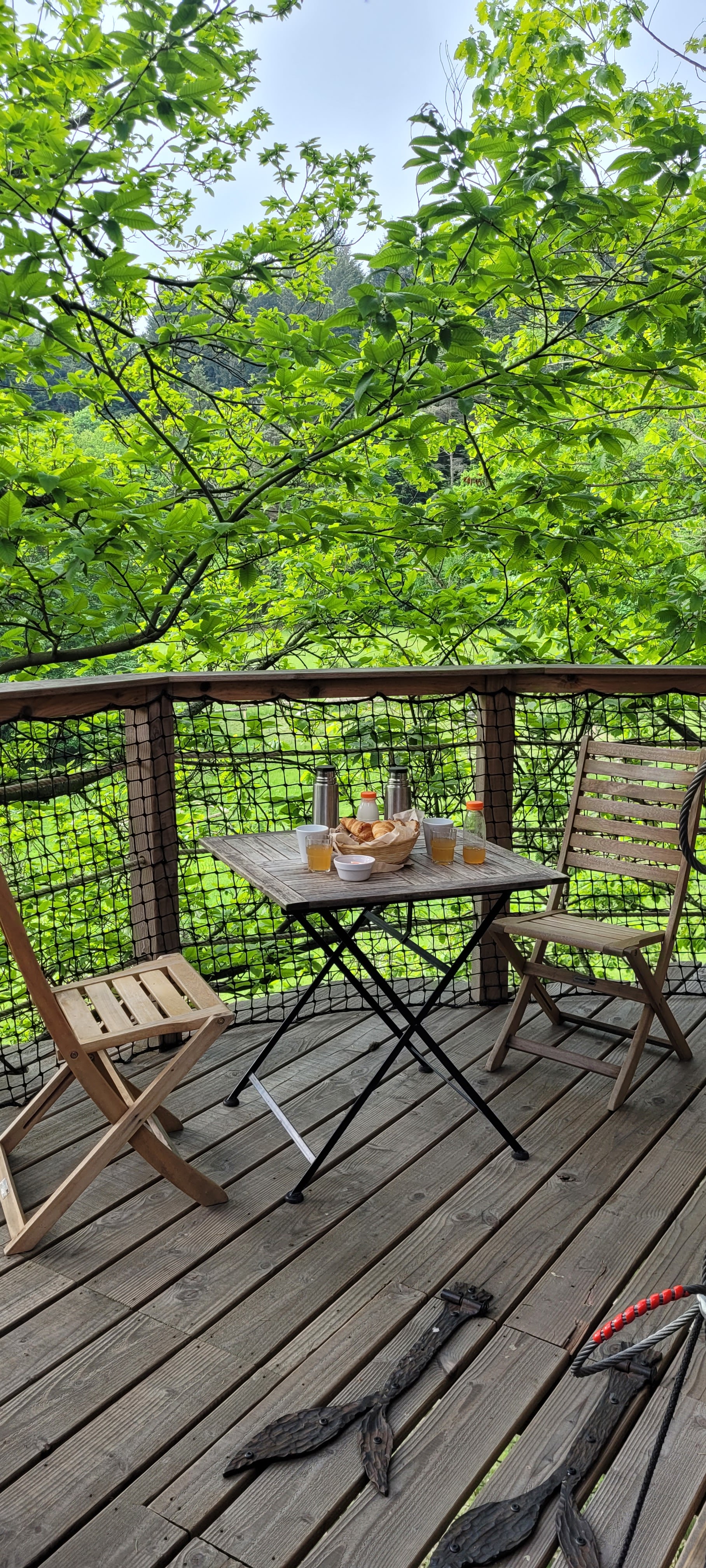 "Expérience ds les arbres originale, nous avons apprécié la vie en hauteur, avec les petits déjeuners, les apéros ardéchois et les repas du soirs ! Manque le wifi a l accueil qq min par jours, ce serait un plus. Pas de réseau sur place....un peu compliqué avec une ado ! 🤗"